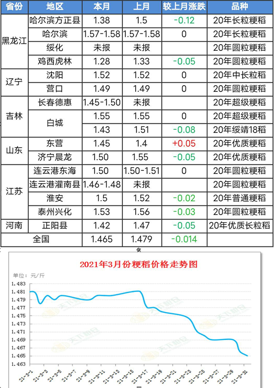 3月1日-3月31日,国内粳稻价格滞涨回落。截至月底,国内粳稻价格指数为1.465元/斤,较上个月跌0.014元/斤。苏皖地区及东北地区粳稻收购价集中在1.25-1.58元/斤,大部分地区较上月跌0.02-0.12元/斤,仅个别地区涨0.05元/斤。各地价格月度变化 情况如下表: